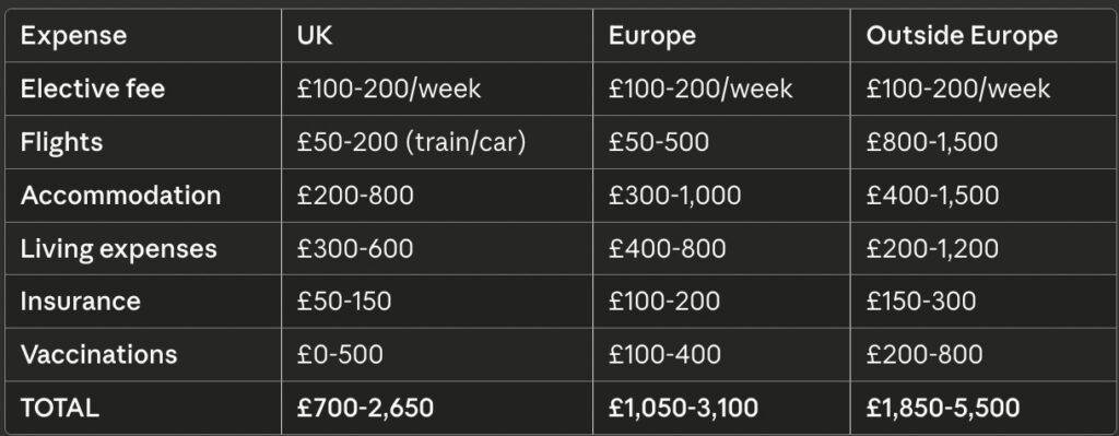 A: £250-£5,000 depending on destination and whether you use a travel company. UK electives are cheapest; distant locations with travel companies are most expensive.